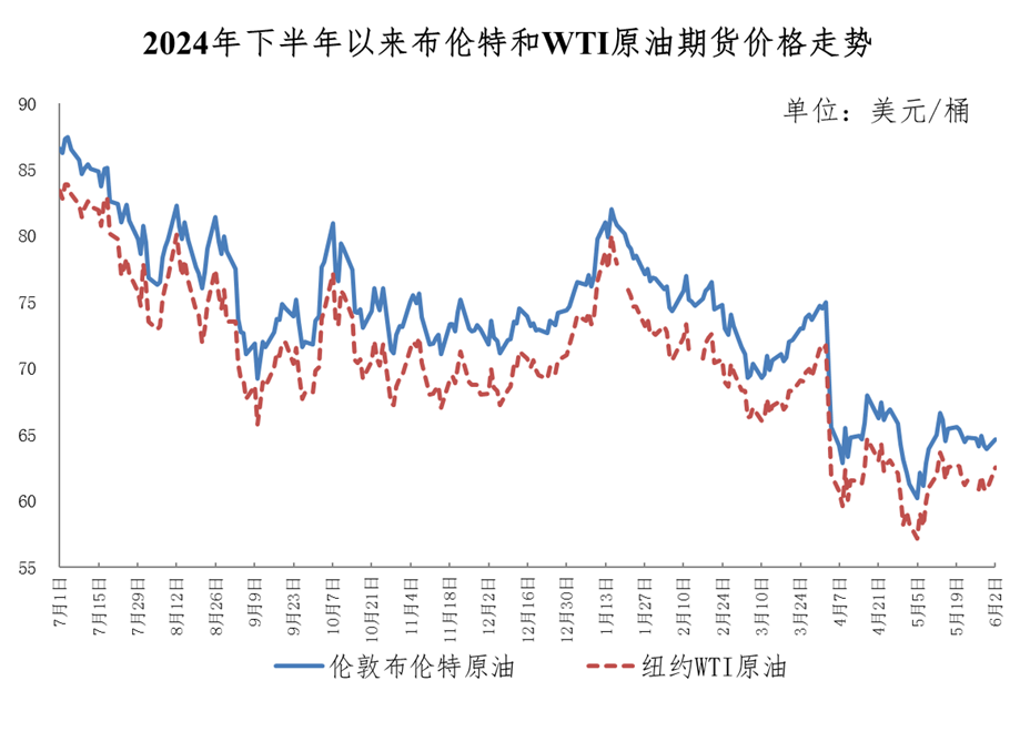 调价周期内,在多空因素交织影响下,国际油价呈区间震荡走势。以布伦特原油期货为例,价格基本在每桶64美元至66美元之间窄幅运行。一方面,供应过剩的担忧、国际资本做空是国际油价下跌的主要因素。“OPEC+”7月加速增产计划由预期转为确定,加剧市场对原油供应过剩的担忧,驱动国际油价下降。同时,截至5月27日布伦特原油净空头规模创近8个月以来最高水平,加剧油价下行压力。另一方面,地缘政治风险、季节性因素支撑原油价格上涨。美伊第五轮核谈判陷入僵局,以色列升级对加沙及约旦河西岸的军事行动,俄乌冲突胶着升级,多重地缘政治风险冲击国际原油供应链。同时,欧美国家进入夏季驾车旺季,成品油消费需求季节性回暖,一定程度上支撑国际油价上涨。