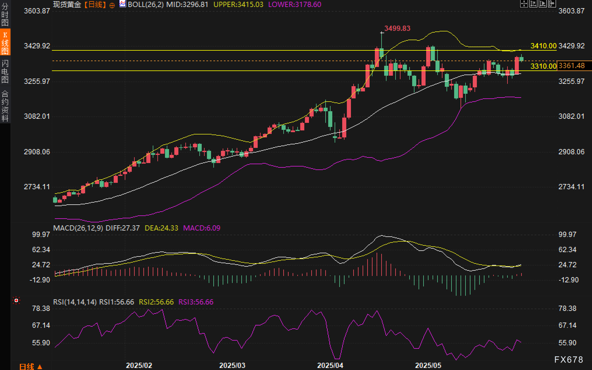 从日线K线图观察,现货黄金近期整体仍运行在中期上涨趋势中,尽管在创下3499.83高点后有所回调,但价格持续在布林带中轨上方整理。当前布林带中轨在3296.81位置,布林上轨位于3415.03,构成当前震荡区间的技术框架。