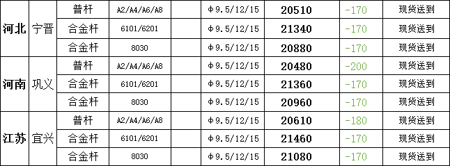 今日市场铝杆加工费报价:聊城报300-400元/吨,积极接单;焦作报300-400元/吨,积极接单;包头报230-350元/吨,积极接单;百色报400-500元/吨,正常接单。下游采购意愿暂缓,巩义地区加工费报350-450元/吨,宁晋地区加工费报350-500元/吨,宜兴地区加工费报450-600元/吨,佛山地区加工费报650-750元/吨。