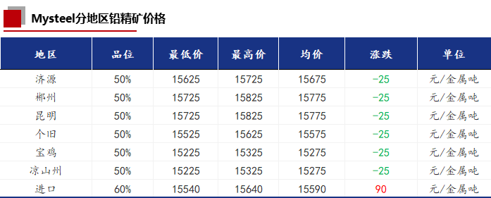 今日国内铅精矿加工费各地区均未调整,和上一交易日持平。受铅价的影响,铅精矿价格较上一交易日跌25元/金属吨。进口铅精矿价格涨90元/金属吨。