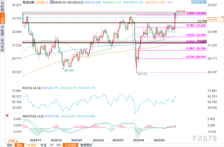 汇通财经APP讯——周二(6月3日)欧盘时段,白银价格下跌,回吐了周一的部分强劲涨幅,周一白银市场突破了33.70美元的关键阻力位。此次回落反映出交易员在重新评估短期头寸时的获利了结行为,同时对美元和黄金技术态势的关注度不断上升。