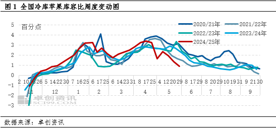 从产地苹果出库监测情况来看,进入五月份之后,冷库苹果出货速度明显放缓。截止到2025年5月29日全国冷库库存比例约为10.33%,本周期(20250523-0528)下降0.89个百分点。与往年出货情况对比来看,与往年季节性变化基本一致,但是由于今年冷库本身库存量偏低,出货量减少时间略有提前。