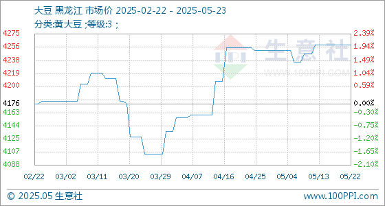 5月23日,生意社大豆基准价为4260.00元/吨,与本月初(4252.00元/吨)相比,上涨了0.19%。