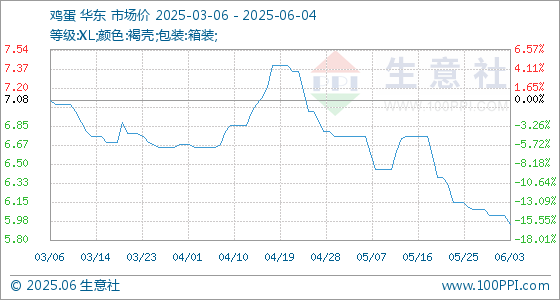 6月4日,生意社鸡蛋基准价为5.95元/公斤,与本月初(6.03元/公斤)相比,下降了-1.33%。