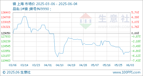 6月4日,生意社镍基准价为122950.00元/吨,与本月初(122425.00元/吨)相比,上涨了0.43%。