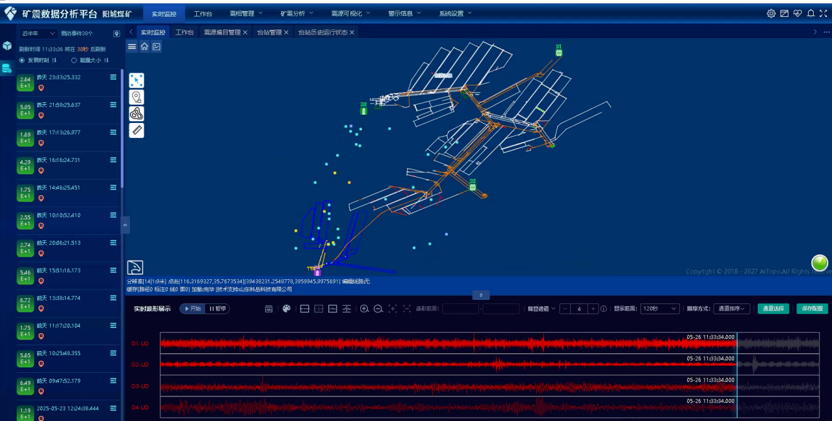 该地震台网采用“井下+地面深井”结合模式,井下设置2个基岩固定台站,地面建设2口测震井(深度分别为100米、255米),确保监测覆盖全矿重点区域。该系统集成矿用隔爆型传感器、深井地震仪等设备,具备实时波形采集、震源定位、震情速报、警情推送等功能,并支持震源机制评估与历史数据分析,为灾害研判提供多维度支持。