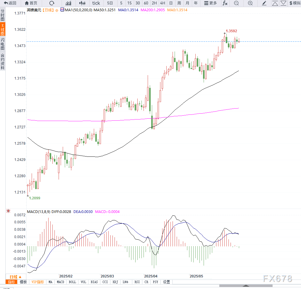 从技术面来看,GBP/USD在经历前一交易日的回调后重新站上1.3500关口,并测试10日均线压力位。若后续能有效突破1.3550区域阻力,英镑或将继续上探至1.3600-1.3630区间。MACD指标已开始拐头向上,短线看涨动能初现。