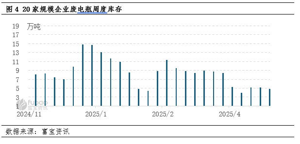 据调研,市场处于报废淡季,目前大型炼厂日到货量较低,回收商反馈本时节较去年同期收货量下降,下降幅度在4成左右。截至5月16日,20家规模企业废电瓶周度库存在4.88万吨,较上周下降0.33万吨,降幅6.33%。库存量处于年内低点水平,低供应成本支撑价格的主要因素点。