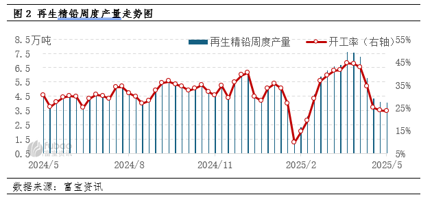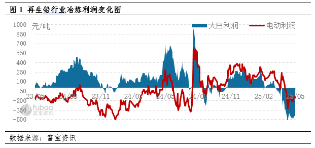 当前废电瓶市场呈现明显的"低库存-高价格"运行特征。受此影响,再生铅企业生产成本持续攀升。而同期再生铅价格受制于下游消费疲软,涨幅明显滞后,导致废电瓶出现利润倒挂。截至5月16日废电动车电池生产再生铅利润约为-170.81元/吨,利用废汽车大白电池冶炼再生铅利润约在-489.32元/吨。部分中小炼厂已被迫减产以控制亏损,4月行业开工率较上月同期下降约7.68个百分点。短期来看,在库存未见明显补充前,废电瓶价格仍将维持高位运行,再生铅企业的成本压力或将持续。