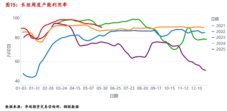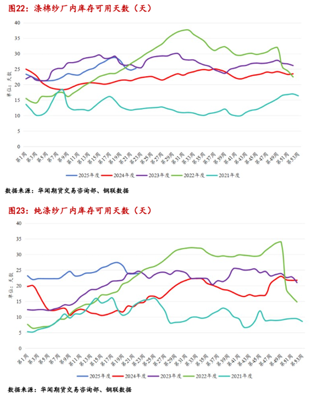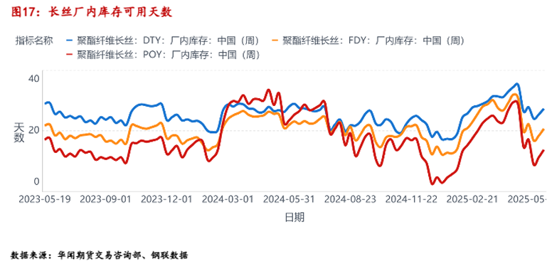 从长丝厂内库存天数来看,月初终端纺织业需求大幅增多,五月份中上旬,三类长丝的库存可用天数之和从历史同期高位大幅降低,在抢出口订单的情况下,长丝库存大幅去化,进入五月下旬,下游纺织订单逐步被消耗,对长丝的需求有所转弱,厂内长丝库存逐步累积。