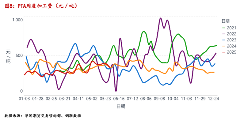 从5月份PTA加工费来看,加工费在353~429元/吨之间波动,从历史数据来看,加工费水平处于中性水平,考虑到PTA未来国内需求前景一般,PTA出口受到关税的限制,加工费难以有大幅增长,装置利润整体一般,PTA可考虑做缩加工费。