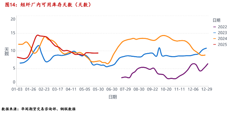 从短纤厂内库存可用天数来看,整个五月份库存呈现出稳定状态,一方面短纤产量有所提升应对下游需求,新增产量与新增需求量维持动态平衡,厂内库存整体呈现出库存水平稳定的状态。
