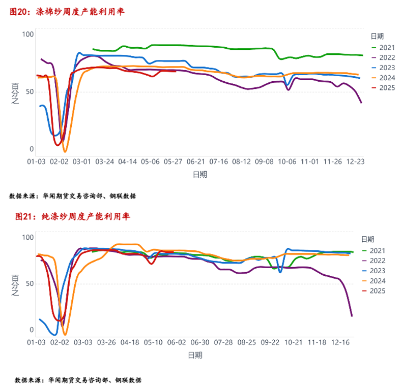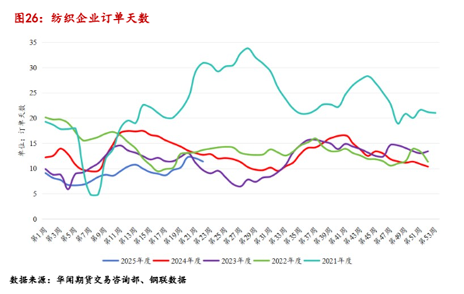 从产销率来看,5月份产销率整体较5月份有所下滑,终端织造需求集中拿货后产销回落,月初下游订单偏多,月底后订单量减少,下游拿货偏向于谨慎,多以刚需采购为主。