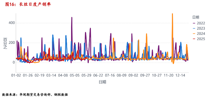 从长丝日度产销率来看,5月初产销率冲高,随后产销率大幅回落,下游短时集中拿货,月初整体需求较为旺盛,5月中下旬随着订单量的减少,下游长丝拿货较为谨慎。