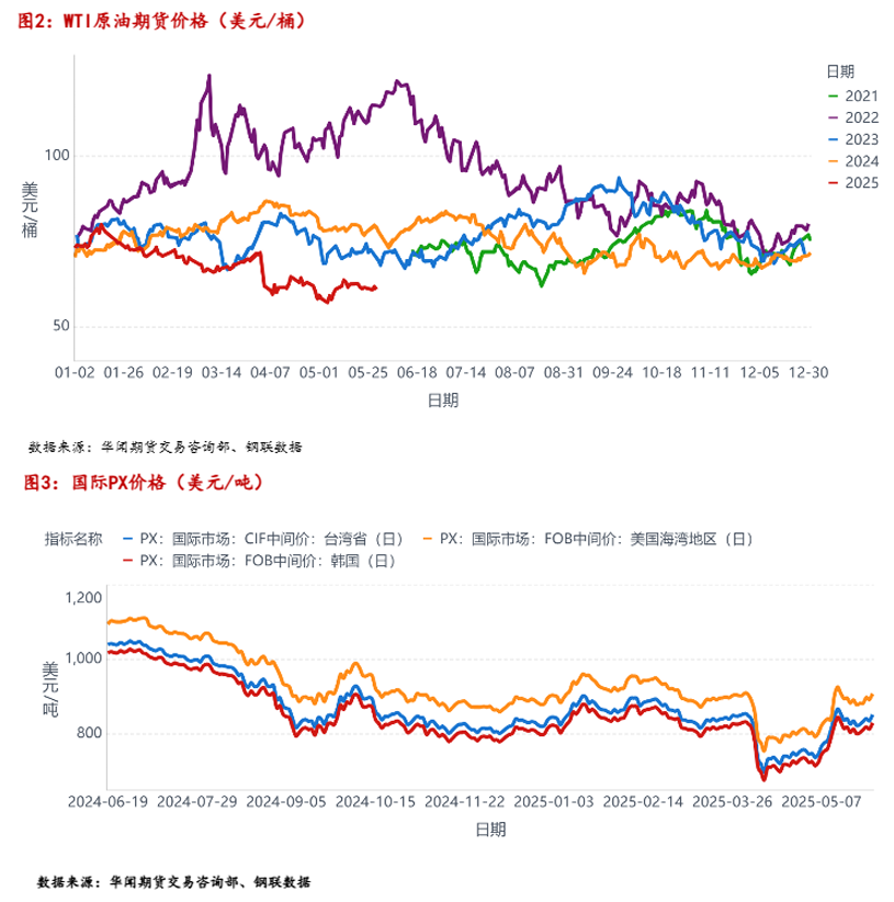 5月份,中美就关税问题超预期达成实质性共识,双方暂缓加征关税90天,国际原油企稳回涨。WTI原油一度跌至55美元/桶以下的低位企稳回涨至65美元/桶左右,但当前原油价格仍为近几年同期最低位,从整体来看,聚酯链上游成本塌陷得到明显修复,聚酯系商品整体企稳上行。原油涨至60美元/桶后,由于OPEC+7月份存有原油增产预期,五月中下旬原油走势呈现震荡偏弱运行。随着OPEC+的原油增产的落地,及当前国际贸易形式的不确定性增多,未来原油整体易跌难涨。