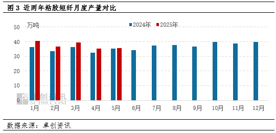 5月虽粘短大厂装置陆续恢复至正常水平,但月中山东雅美、高密银鹰阶段性降负,潍坊欣龙继续限产以及新疆中泰一工厂停工检修等影响,国内粘胶短纤月度产量增幅受限。据卓创资讯统计,截至5月30日,中国粘胶短纤预计月产量在35.72万吨,较4月产量增加0.25万吨,增加幅度为0.69%。综合看来,5月国内粘胶短纤大厂检修结束后因部分企业降负避险情况增加,供应整体呈现先增后减态势。因此,基本面偏松格局有所修复,一定程度支撑粘胶短纤市场止跌企稳运行。
