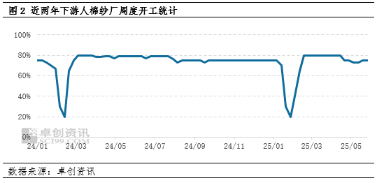 五一假期下游放假效应相对明显,且部分纱厂出货不畅情况下为避免憋库风险开工负荷小幅下滑。虽月中关税阶段性缓和一定程度带动一小部分纱线出口订单,但整体看来市场需求表现仍显一般。据卓创资讯统计,5月下游人棉纱厂平均开工负荷在74%,较4月环比下降4个百分点。下游纱厂生产情绪谨慎,对原料粘短择机刚需采买为主,需求面支撑不足导致粘胶短纤市场重心偏弱整理。