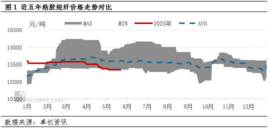 2025年国内粘胶短纤价格重心缓慢走低,并在5月份逐渐触及往年同期最低点。截至5月30日,中国粘胶短纤收盘价为13050元/吨(承兑),较目前年内最高点下跌700元/吨,跌幅5.09%。在此阶段,供需面偏弱运行是导致粘胶短纤继续震荡走低的主要原因。