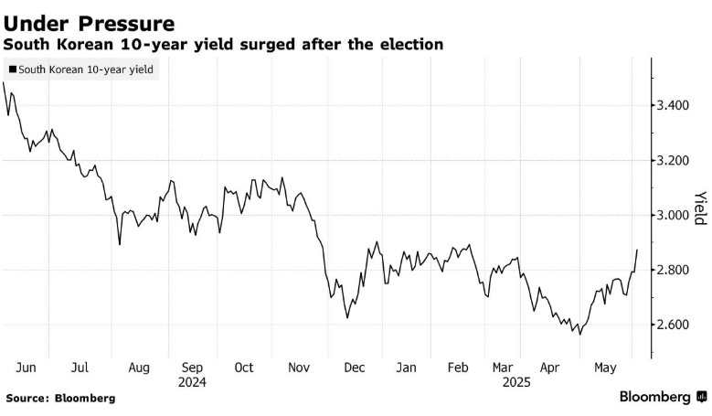 随着投资者们愈发担忧韩国左倾立场的新总统李在明将开启伴随政府债务攀升的财政扩张时代,韩国国债正在面临更加艰难的局面。在李在明赢得韩国总统大选、结束数月政治不确定性之后,10年期韩国国债收益率周三飙升逾10个基点,至2.90%。在当天举行的30年期国债标售中,中标倍数降至2022年4月以来最低,也反映出投资者们对债务供给增加的担忧。