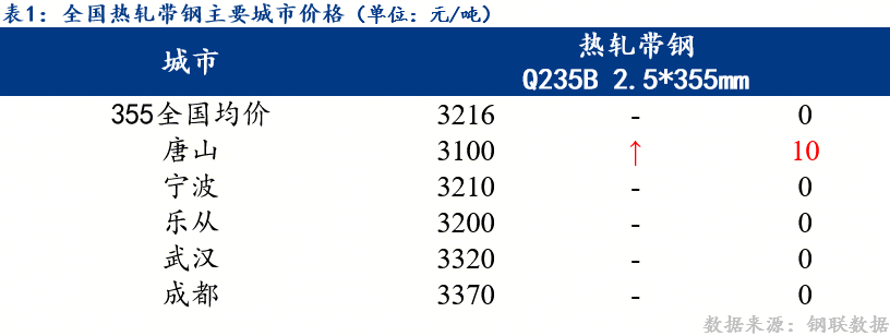 29日热轧带钢全国主要城市价格震荡下行,截至发稿时2.5*355mm热轧带钢均价3216元/吨,较昨稳,其中2.5*355mm主要城市报价为唐山3100元/吨,宁波3210元/吨,乐从3200元/吨。