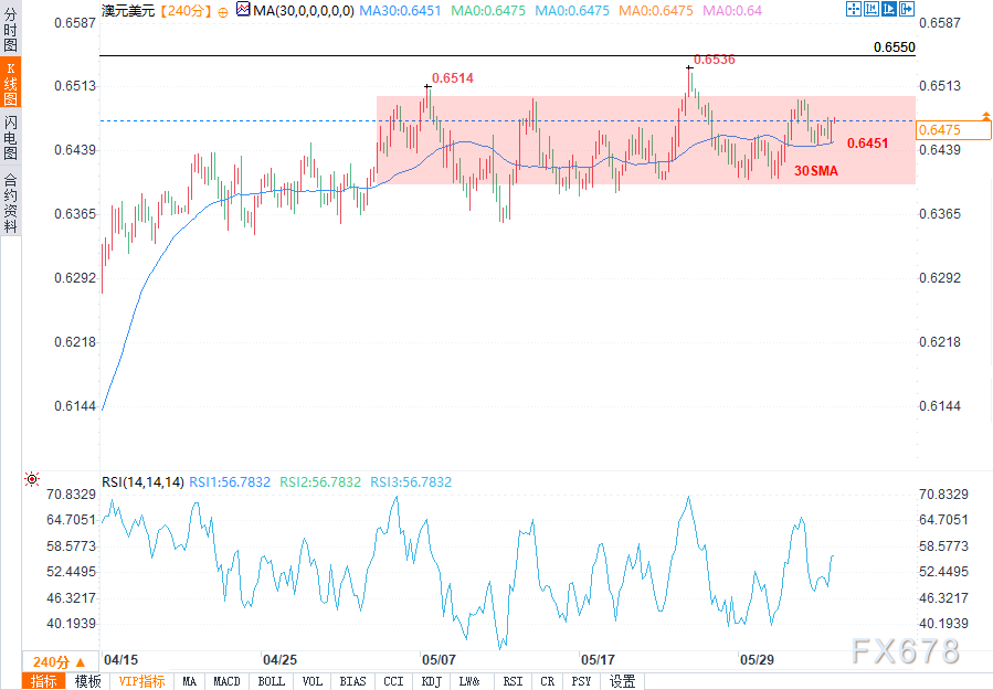 汇通财经APP讯——周三(6月4日)欧盘时段,分时图上,澳元/美元价格围绕均线(0.6463)波动,有明显的上下震荡,短期多空博弈较激烈,价格在一定区间内反复争夺。当前澳元相对美元偏强,但未进入超买区域。