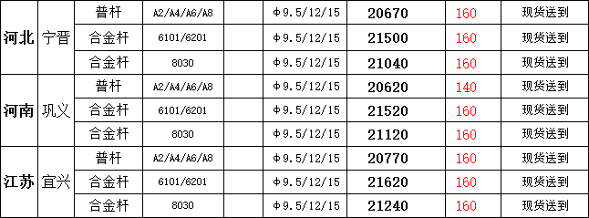 6月4日宁晋市场普铝杆现货报盘价20670元/吨,较上一交易日报价涨160元/吨;巩义市场普铝杆现货报盘价20620元/吨,较上一交易日报价涨140元/吨;宜兴市场普铝杆报盘价20770元/吨,较上一交易日报价涨160元/吨。