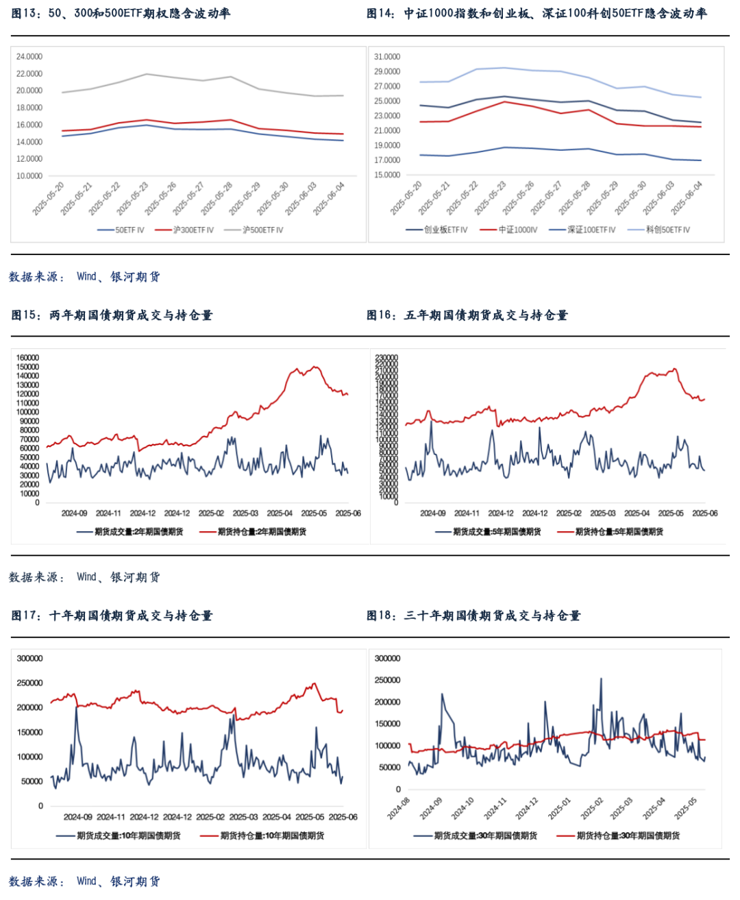 期权方面,期权标的价格震荡上行,期权品种成交量维持低位。品种上看,500ETF期权相对活跃。隐波方面,多数期权品种隐波中枢小幅回落,基本符合预期。
