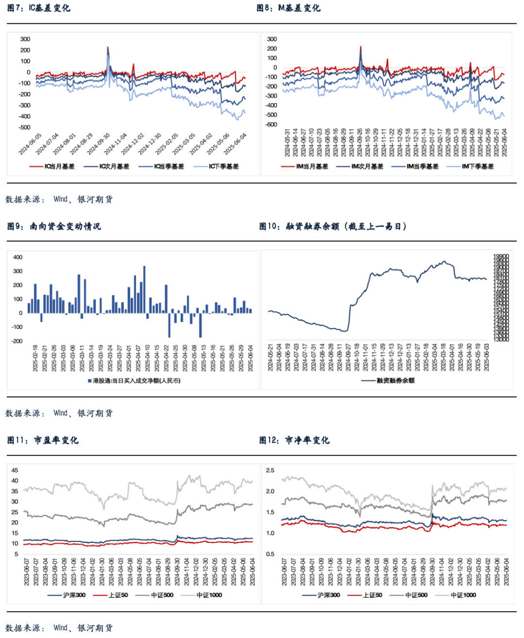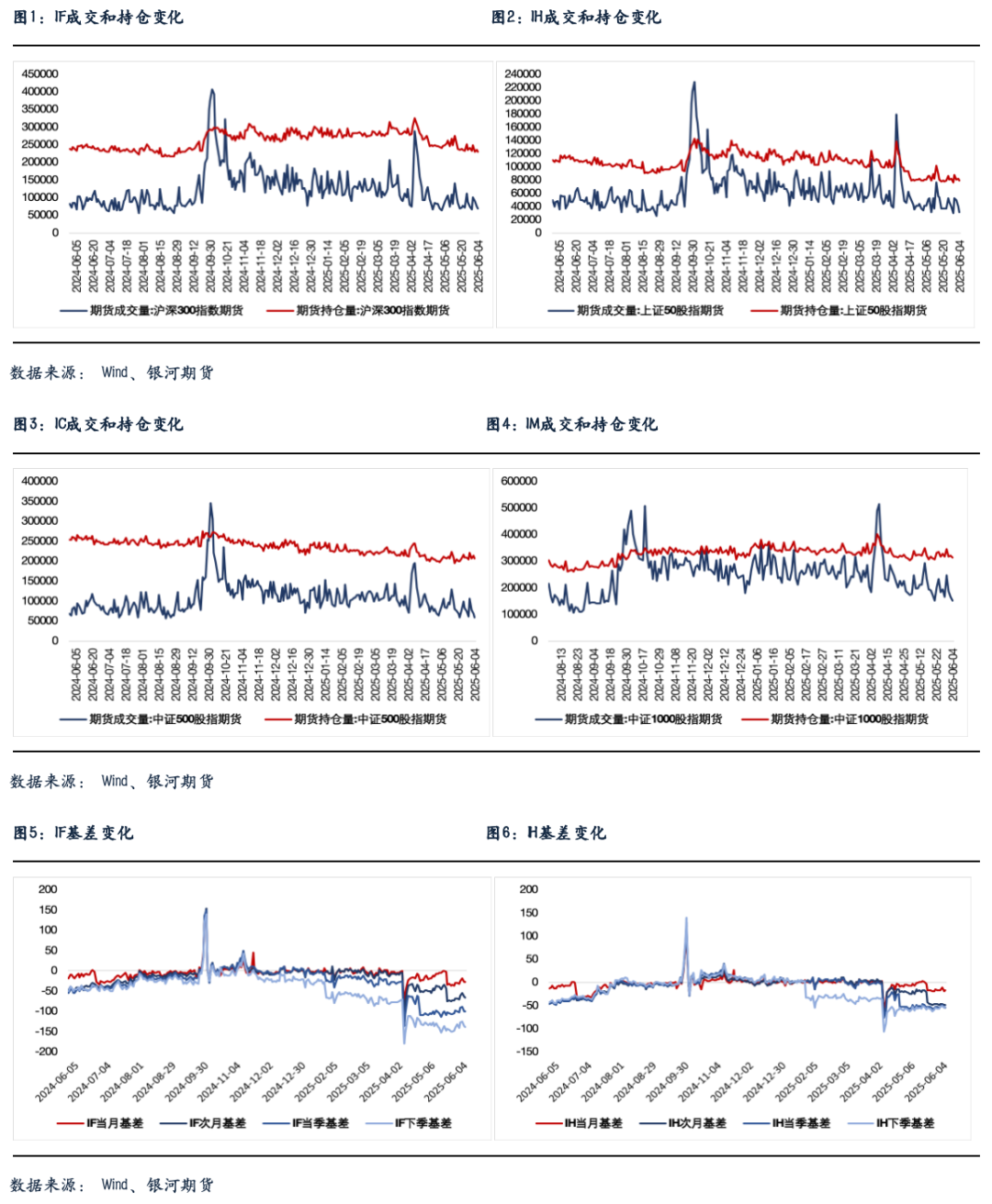 股指期货继续反弹,至收盘,主力合约IH2506涨0.16%,IF2506涨0.41%,IC2506涨0.76%,IM2506涨0.82%。各品种贴水略有分化,近月合约贴水略有收敛,但远月合约贴水继续走阔。IM、IC、IF和IH成交分别下降7.9%、16.3%、7.1%和20.4%,持仓分别下降1.8%、3.4%、2.9%和3.8%。