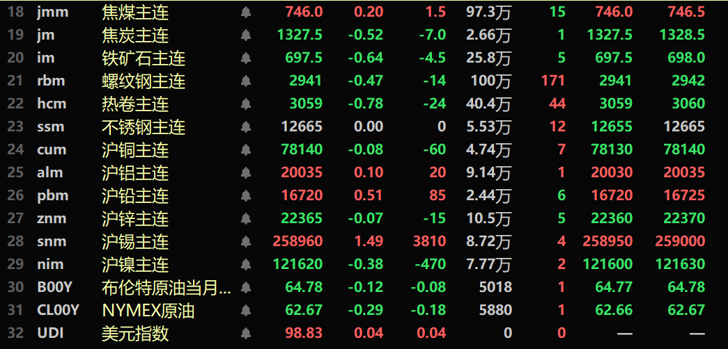 黑色系多飘绿,铁矿跌0.64%,螺纹跌0.47%,热卷跌0.78%。不锈钢平于12665元/吨。双焦方面:焦煤涨0.2%,焦炭跌0.52%。