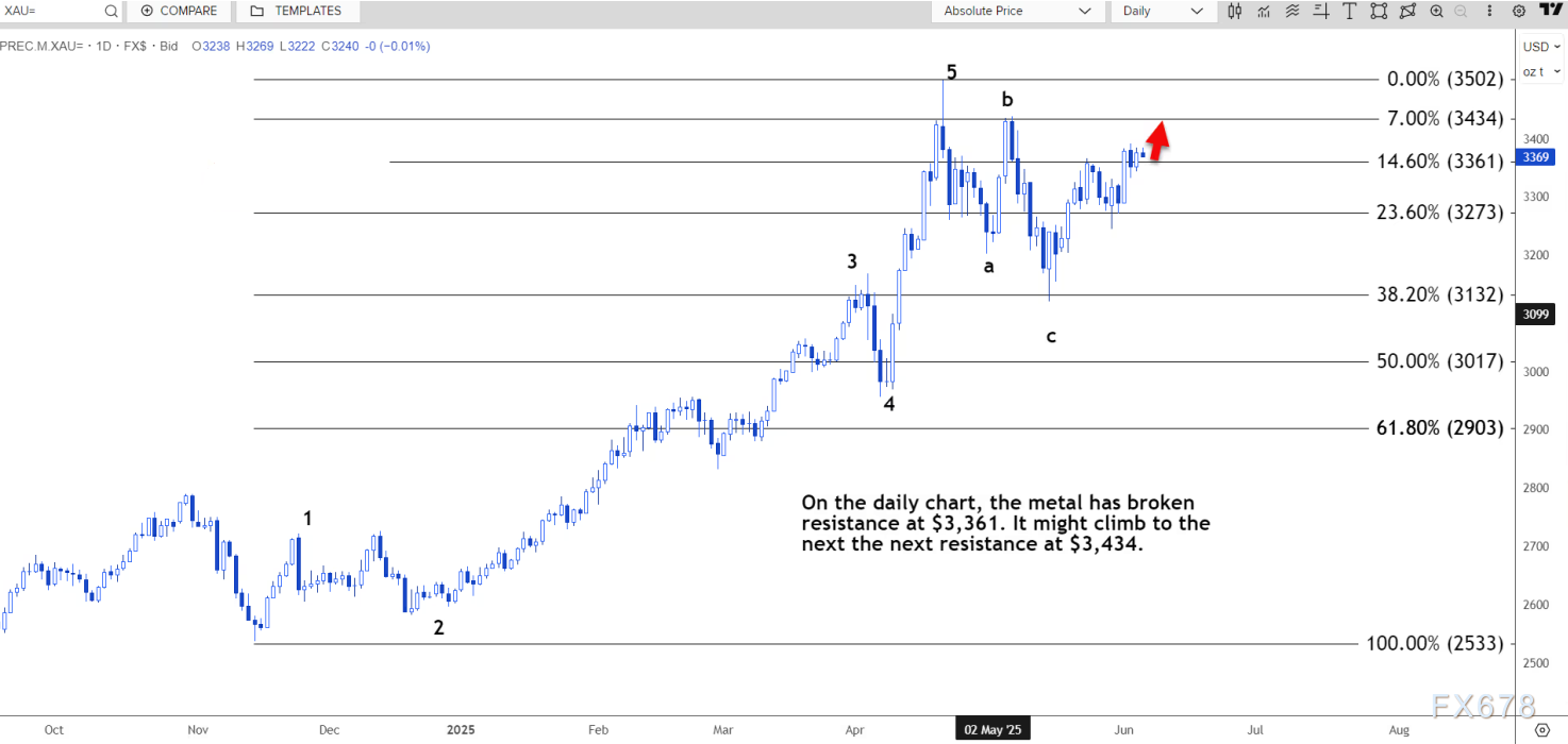 如果突破3408美元/盎司,则可能上涨至3,440美元/盎司。日线图显示,金价已突破3361美元/盎司的阻力位。金价可能攀升至下一个阻力位3434美元/盎司。