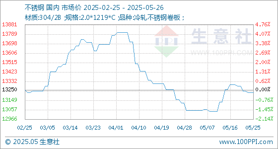 5月26日生意社不锈钢基准价为13225.00元/吨