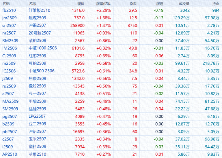 6月5日,午盘收盘,国内期货主力合约涨跌不一,焦煤、沪锡涨超1%,豆粕、菜粕、20号胶涨近1%。跌幅方面,氧化铝、尿素跌近3%,原木跌超1%。