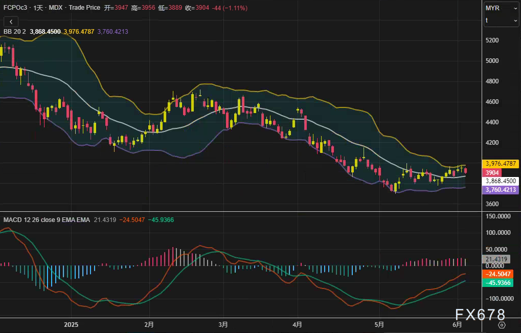 汇通财经APP讯——周四(6月5日)马来西亚衍生品交易所(BMD)棕榈油主力合约FCPOc3今日收跌1.11%,报3904林吉特/吨,终结此前两日连涨。技术面上,布林通道(20,2)中轨位于3976林吉特,MACD柱状图虽仍处负值区间但绿柱收窄,显示短期调整压力尚未完全释放。
