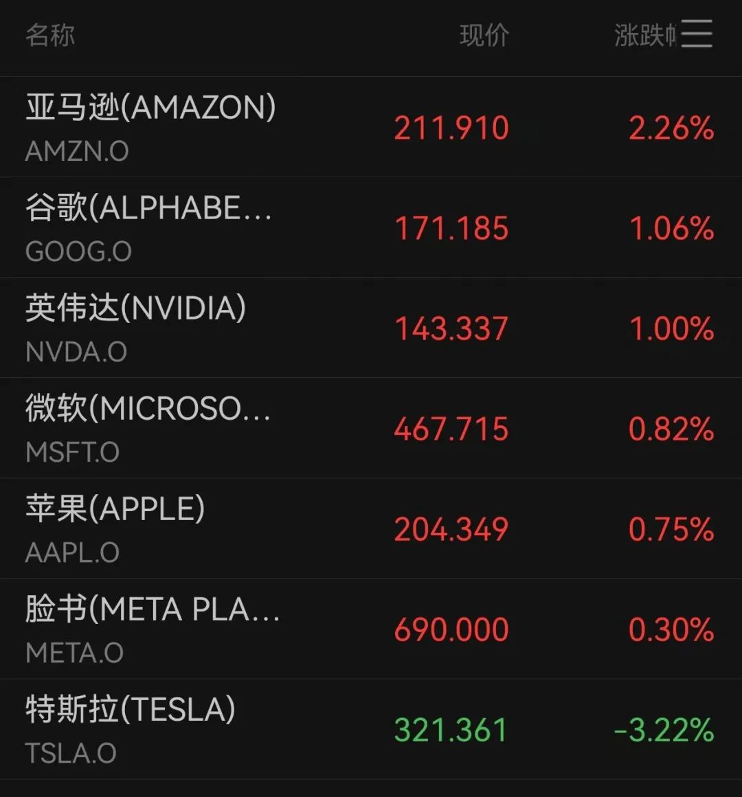 美股科技股七巨头中,特斯拉跌超3%,其余均有上涨。