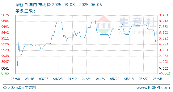 6月6日生意社菜籽油基准价为9296.67元/吨