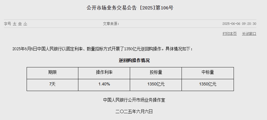6月6日,央行公告,今日开展1350亿元7天逆回购操作,投标量1350亿元,中标量1350亿元,操作利率为1.40%,与此前持平。