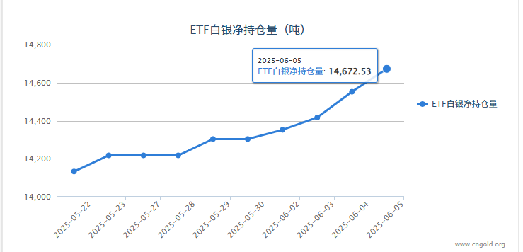 全球最大白银etf--iShares Silver Trust持仓报告显示,6月5日白银etf持有量为14672.53吨,较上一日增持120.16吨。上周四(6月5日)现货白银尾盘收于35.65美元/盎司,上涨1.16美元或3.36%,盘中白银价格最高上探至36.07美元/盎司,最低触及34.41美元/盎司。