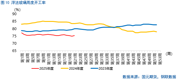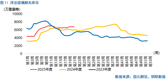 步入6月,预计玻璃需求延续偏弱,随着企业出货压力增加,厂商存在降价出货预期,但后续随着淡季及梅雨季节的到来,行业库存压力尚存。5月下游拿货偏向刚需补货,现货市场表现较为平淡,终端刚需支撑能力不足,个别地区月底降价出货略有起色。玻璃深加工需求略有改善,但同比偏弱,截至5月中旬,全国深加工样本企业订单天数均值10.4天,环比略有修复0.5%,但同比下降7.2%。5月下旬,浮法玻璃库存为338.85万吨,较上月底增加11.48万吨,环比增加3.51%。
