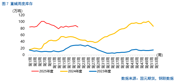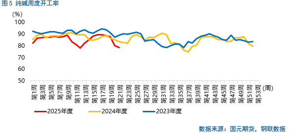 5月纯碱整体供应有所下降。其中,轻碱、重碱供应双双下降。纯碱检修量增加,而新增装置在中下旬方才释放,湖北双环及连云港碱业共计140万吨产能装置落地,后续产能预计在年底前投放,具体时间待定。截至5月23日,本月国内纯碱产能利用率为83.83%,环比减少4.19个百分点;从产量上看,本月国内纯碱平均周产量为70.77万吨,环比减少4.42%。