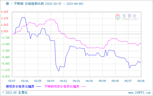 据生意社价差分析工具显示,镍和不锈钢价格基本相似,近期镍和不锈钢价小幅震荡走势。