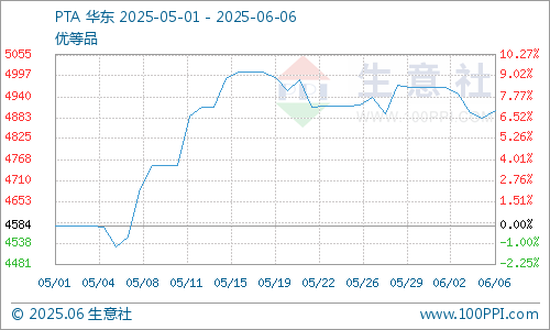据生意社商品行情分析系统,进入6月国内PTA现货市场行情重心下移,截止6月6日华东地区PTA市场均价在4903元/吨,较月初下跌1.26%。