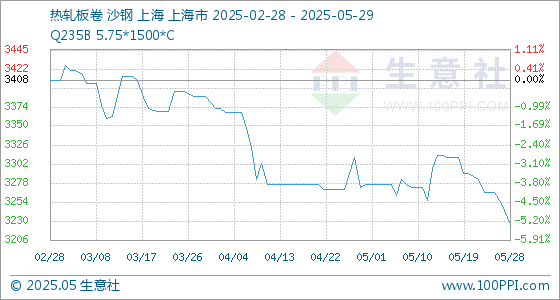 5月29日,生意社热轧板卷基准价为3226.67元/吨,与本月初(3276.67元/吨)相比,下降了-1.53%。