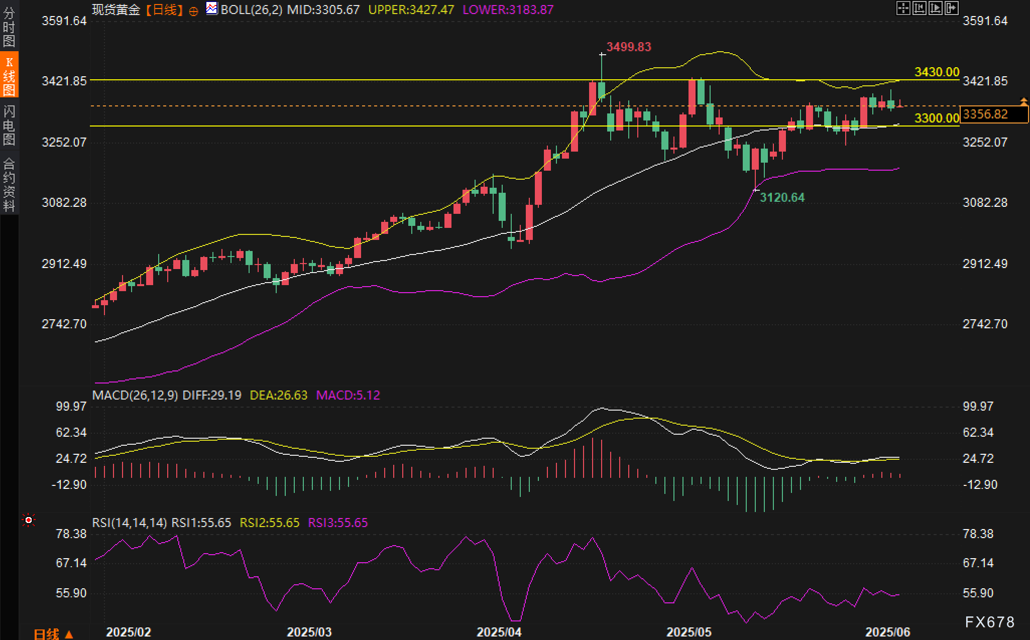 从黄金日线K线图观察,金价已连续多个交易日运行于3300~3430美元的箱体之中,显示市场进入明显的盘整状态。