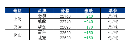 今日上海市场升贴水涨跌-160元/吨,天津市场升贴水涨跌为-90元/吨,佛山市场升贴水涨跌为-70元/吨。