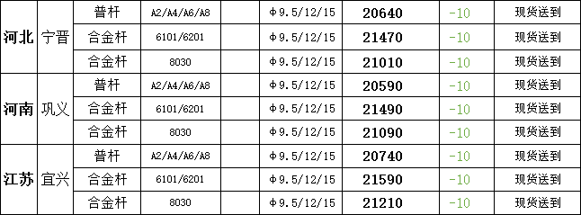 6月6日宁晋市场普铝杆现货报盘价20640元/吨,较上一交易日报价跌10元/吨;巩义市场普铝杆现货报盘价20590元/吨,较上一交易日报价跌10元/吨;宜兴市场普铝杆报盘价20740元/吨,较上一交易日报价跌10元/吨。