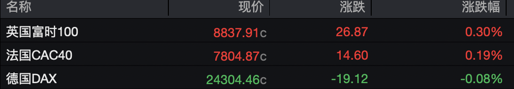欧洲股市方面,德国DAX指数跌0.08%,报24304.46点;法国CAC40指数涨0.19%,报7804.87点;英国富时100指数涨0.3%,报8837.91点。本周以来,德国DAX指数涨1.28%,法国CAC40指数涨0.68%,英国富时100指数涨0.75%。