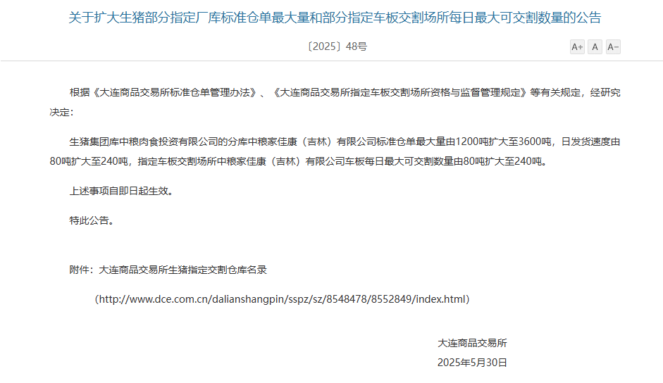 5月30日,大商所公告,根据《大连商品交易所标准仓单管理办法》《大连商品交易所指定车板交割场所资格与监督管理规定》等有关规定,经研究决定:生猪集团库中粮肉食投资有限公司的分库中粮家佳康(吉林)有限公司标准仓单最大量由1200吨扩大至3600吨,日发货速度由80吨扩大至240吨,指定车板交割场所中粮家佳康(吉林)有限公司车板每日最大可交割数量由80吨扩大至240吨。