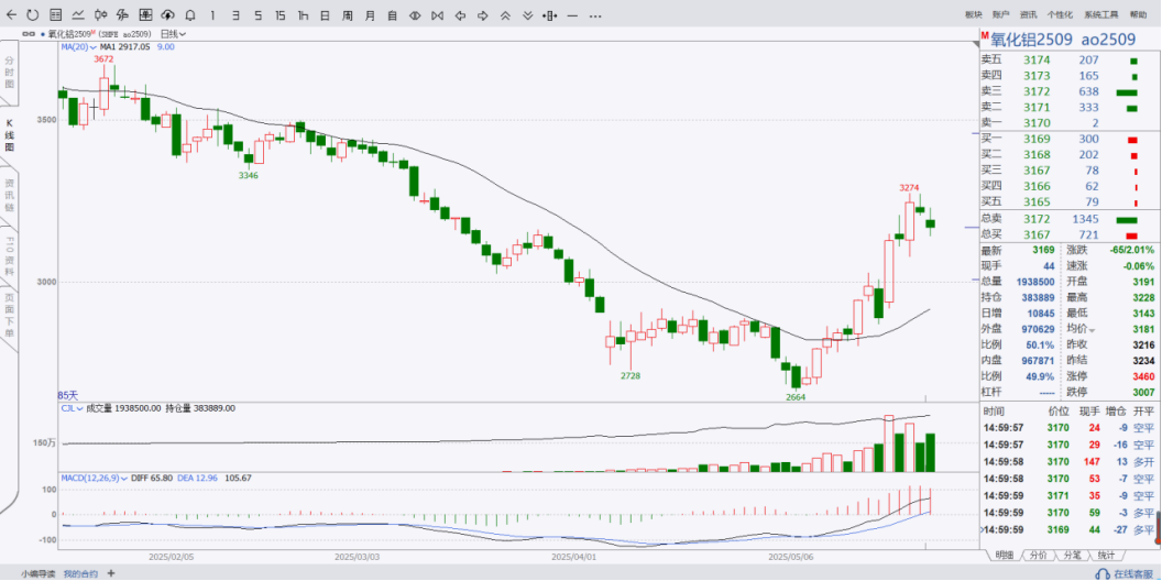 今日氧化铝期货主力合约ao2509继续回调,日内最高价触及3228元/吨,最低触及3143元/吨,开盘价3191元/吨,收盘价3169元/吨,日跌幅2.01%,成交量1938500手,持仓量383889手,今日成交量与持仓量均有所增加。