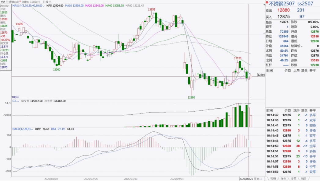 截至5月22日收市,不锈钢主力合约SS2507合约开盘价12870点,最高12920点,最低12850点,收于12880点、当日上涨10点,涨幅0.08%,振幅0.54%。