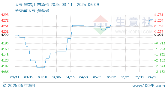 6月9日,生意社大豆基准价为4276.00元/吨,与本月初(4260.00元/吨)相比,上涨了0.38%。